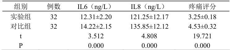 比较两组患者的炎性因子水平(IL6、IL8)与疼痛评分,0-10 分,得分越低疼痛感越轻。