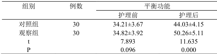 本次研究结果显示,对照组患者肢体功能评分同观察组比较差 <0.05 ;护理前组间患者平衡功能均无差异 P>0.05 ,护理后对照组患者同观察组比较差P <0.05 .