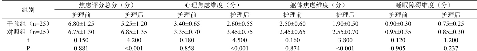 护理前两组各维度评分均无统计学差异( ΦP>0.05 )。护理后干预组总分显著低于对照组( Φp<0.05 ),见表1。