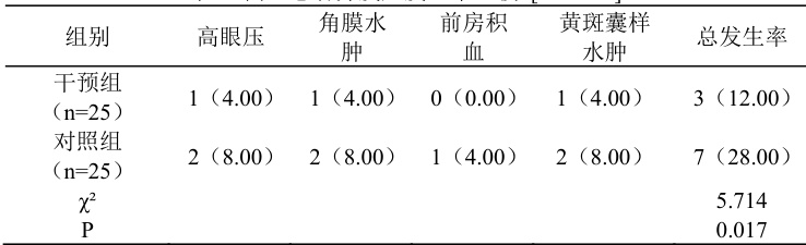 记录患者术后72 小时内发生的并发症,包括高眼压、角膜水肿、前房积血、黄斑囊样水肿四种主要类型[4]。