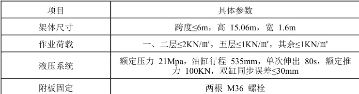 JFYM100 型爬模主要包含附板装置、H 型导轨、架体系统、液压升降系统及安全防护系统等。两附墙点间架体跨度≤6m,架体高 15.06m 、宽 1.6m;作业荷载:一、二层≤2KN/㎡,五层≤1KN/㎡,其余≤1KN/㎡。液压系统额定压力 21Mpa,油缸行程 535mm(单次伸出 80s),额定推力 100KN,双缸同步误差≤30mm,可单缸、双缸或多缸操作;附板装置通过两根 M36螺栓固定。具体参数如下表: