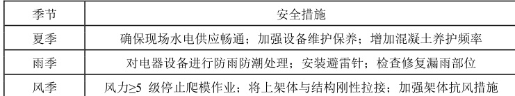 为应对不同季节的施工特点,在特殊天气施工时需采取针对性措施(见表 2)。夏季施工时,要确保现场水电供应畅通,同时加强设备的维护保养,以应对高温环境对设备的影响,并且在高温天气下需增加混凝土的养护频率,保证混凝土施工质量;雨季施工时,需对电器设备进行全面的防雨防潮处理,同时安装避雷针以防范雷击风险,还要及时检查并修复可能存在的漏雨部位,确保施工安全;风季施工时,当风力达到 5 级及以上时,应立即停止爬模作业,并将上架体与结构进行刚性拉接,同时加强架体的抗风措施,保障架体的稳定性。