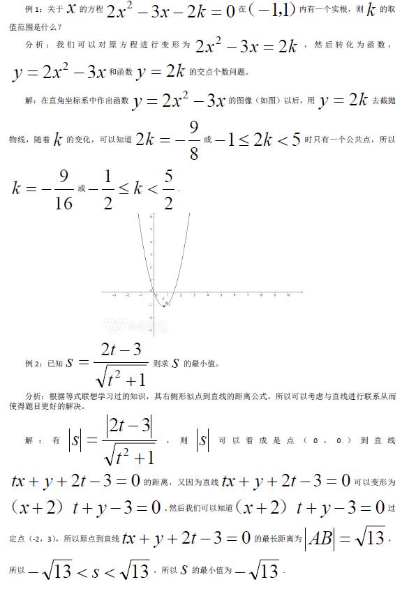 其实在中小学数学中像这样运用的数形结合思想来解题的题目还有很多,如果能够找当代数与几何中的联系,知道如何进行转化,这样是很有助于解决数学问题的,这与学生学习数学有着很大的帮助。
