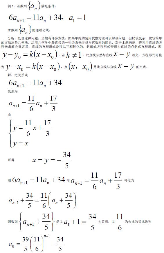 这个题目就是在求数列通项公式的时候通过用几何中的直线方程等知识来解决,再求通项公式的时候有代数法会特别复杂,然而用几何的方法就很轻松的解决问题,从而达到事半功倍的效果,同时也是一个和好的解题方法,让一个问题有多个不同的解法。