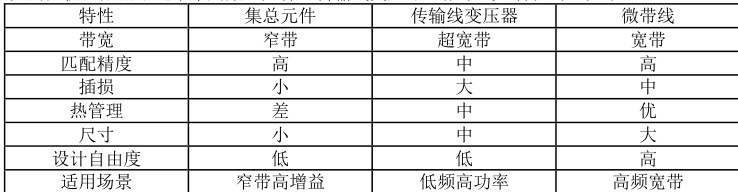 阻抗匹配网络作为宽带功率放大器设计过程中的关键,其主要作用是为了使晶体管的输入、输出达到最佳的匹配状态,从而能够在宽频带范围内实现良好的功率传输,其性能的好坏对电压驻波比、稳定性、增益以及增益平坦度等多个关键指标都有明显的影响。目前,常见的阻抗匹配网络通常采用集总元件,传输线变压器,微带线,特性对比如下: