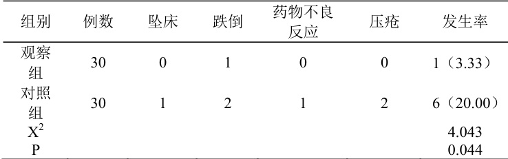 对比两组中不良事件发生情况,包括:坠床、跌倒、药物不良反应、压疮等。