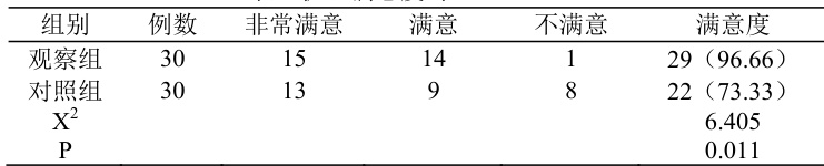 比较两组患者的护理满意度,采用我院自拟满意度调查问卷,满分100分, >80 分为非常满意、60-80 分满意、 <60 分为不满意,满意度