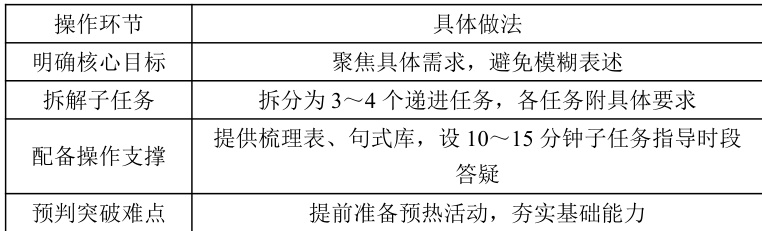 明确每个任务的核心目标,避免目标模糊导致学生无从下手,“职场英语汇报”任务,核心目标定为“用英语清晰传达专业项目核心内容”,而非笼统要求“完成英语汇报”。将核心目标拆解为 3~4 个递进性子任务,拆解为“梳理汇报核心信息—组织汇报语言—模拟汇报演练—优化汇报细节”,每个子任务明确具体要求,“梳理核心信息”需标注每个要点对应的专业英语词汇[3]。为每个子任务配备操作支撑,提供汇报要点梳理表、专业汇报句式库,同时设置 10~15 分钟的“子任务指导时段”,教师针对学生在拆解任务中遇到的问题进行针对性讲解。预判任务执行中的共性难点,包括“长难句表达不连贯”,提前准备“句子拆分重组练习”等预热活动,让学生在完成子任务前具备基础能力,确保每一步操作都有明确指引与支撑(表1)。
