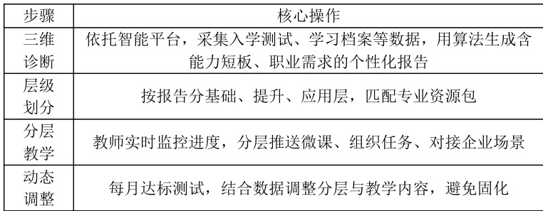 依托智能教学平台构建覆盖“基础水平+学习能力 + 职业需求”的三维诊断体系,通过采集学生入学摸底测试、过往英语学习档案及专业方向问卷等数据,运用协同过滤算法与学习能力评估模型,生成包含词汇量、语法掌握度、听说读写短板及职业英语需求的个性化诊断报告,为分层教学提供数据支撑(表1)[3]。基于诊断结果划分基础层、提升层、应用层三个层级,每个层级设定明确的阶段性目标与配套学习资源包,资源包由平台根据技工院校专业目录自动匹配,为汽修专业应用层学生推送汽车维修场景对话、零件英文说明书解读等内容。教学过程中,教师通过平台实时查看各层级学生的学习进度、作业完成质量及互动参与度,针对基础层学生增加线上语法微课推送频率与一对一在线答疑时段,为提升层组织小组协作式主题任务,为应用层对接企业真实英语业务场景。每月通过平台开展分层达标测试,结合测试数据与学生学习行为变化,动态调整分层结果与教学内容,避免分层固化,确保每个学生都能在适配的学习节奏中提升。