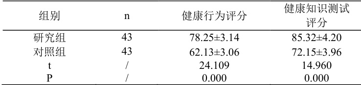干预后,研究组的健康行为和健康知识测试评分均比对照组高,有差异( P<0.05 ),见表1: