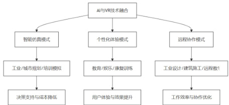 人工智能与虚拟现实技术的深度融合形成了多种创新应用模式,为行业数字化和智能化转型提供了有力支撑。智能仿真模式是融合的核心形式之一,通过AI驱动虚拟环境的动态变化,可以对工业生产线、城市规划和培训模拟等场景进行高精度仿真,实时分析操作流程、资源配置及潜在风险,为决策提供科学依据,并降低现实操作中的成本和安全隐患。个性化体验模式则充分发挥AI在行为分析与偏好识别方面的优势,根据用户的操作习惯、兴趣偏好和心理状态动态调整VR场景,实现高度定制化的沉浸体验,这在教育、娱乐及康复训练等领域表现尤为突出,能够显著提升用户满意度和学习效果。远程协作模式通过将AI分析能力与VR沉浸式交互相结合,实现跨地域团队在虚拟空间中的协同工作,支持实时信息共享、任务分配和交互优化,尤其适用于工业设计、建筑施工及远程教学等场景,不仅提升了工作效率,也扩展了协作的边界和模式,为企业和机构的数字化发展提供了新的路径和创新动力。技术融合模式如下图1 所示。
