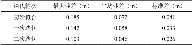 从表中数据可以看出,通过逐步迭代优化,高程拟合精度稳步提升,最大残差下降超0.08 米,标准差亦显著减小,验证了残差控制策略的有效性与可实施性。