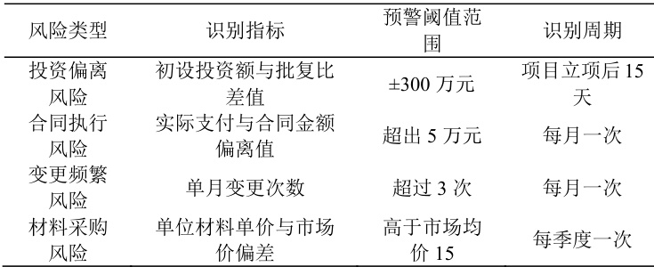 在全过程审计中构建风险清单是实现风险系统识别与量化管理的重要手段。清单需围绕项目关键控制节点进行划分,包括立项阶段的投资偏离风险、招标阶段的预算失控风险、施工阶段的现场签证异常风险与结算阶段的计量审核不实风险[2]。每项风险需配套设定识别指标。从指标设计来看,应以定量与定性相结合为主,兼顾业务流程逻辑。以下是部分推荐的指标表:
