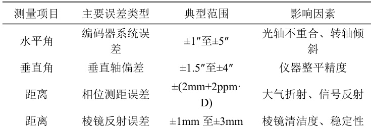 表 1 所列误差为常见全站仪测量中不同因素导致的典型误差范围,有助于操作者在具体应用中识别主要误差源并采取针对性优化措施。根据测量任务精度要求,可合理选择容许误差控制范围,并在作业前进行误差敏