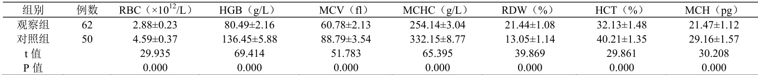 观察组患者 RDW 指标高,其余指标均低于对照组, P<0.05 ,详见表1。