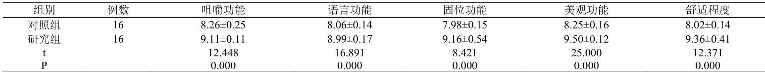 将32 例牙齿缺陷患者作为研究对象,时间是2024 年4 月至2025 年3月,分成对照组和研究组16 例。对照组中,男6 例,女10 例,年龄25-56岁,平均( 40.53±1.33⟩ )岁;研究组,男女各8 例,年龄范围24-56 岁,均值( 40.62±1.27, )岁。未见差异性, P>0.05 ,可比较。纳入标准:缺牙间隙正常;口腔健康良好;同意参加研究。排除标准:抑郁症等精神类疾病;听力、视觉障碍;资料不完整。