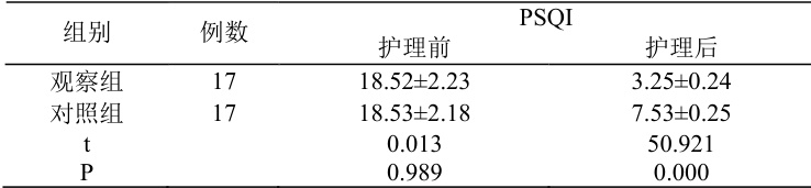 比较护理前后两组患者的睡眠质量变化情况,采用匹兹堡睡眠质量量表(PSQI)评估,量表满分0-21 分,得分越高睡眠质量越差。