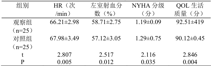 如表 1,观察组治疗后 HR、NYHA 分级均低于对照组,LVEF、QOL水平均高于对照组, P<0.05 。