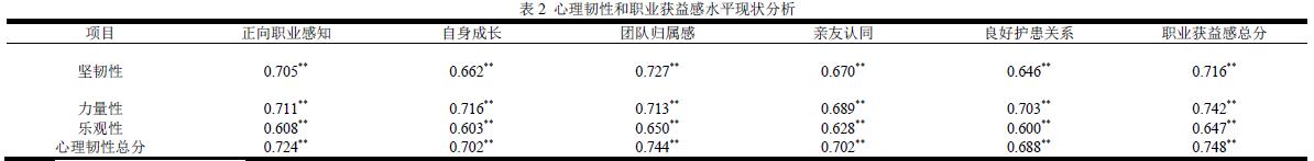 心理韧性得分:乐观性(10.04±2.67)分、力量性(21.06±5.49)分、坚韧性(33.01±9.19)分、总分(64.13±16.57)分;职业获益感的得分:正向职业感知(26.65±4.94)分、自身成长(31.86±5.32)分、团队归属感(23.20±4.18)分、亲友认同(23.32±3.92)分、良好护患关系(24.08±4.20)分、职业获益感总分(129.13±21.51)分。心理韧性和职业获益感保持正相关,(p<0.05, p<0.01)见表2。