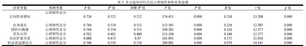 2.3 多元逐步回归方法心理韧性和职业获益感多元逐步回归方法分析显示,职业获益感可被心理韧性正确预测,见表 3。