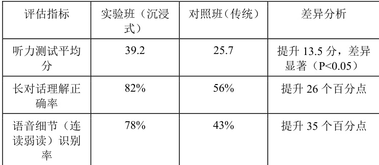 学生调查问卷结果表明, 87% 的实验班学生觉得“VR 场景让听力更有代入感,能快速抓住逻辑”, 79% 的学生表明“平台个性化练习帮助解决了自己的薄弱点”;对照班中仅有 38% 的学生觉得“听力学习有收获”;课堂观察显示,实验班学生每课时主动提问次数达18 次,为对照班5 次的3.6 倍,且任务完成率高达 95% ,明显高于对照班的 72% 。