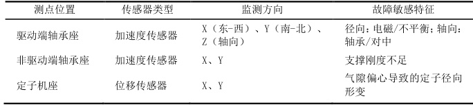 传感器的位置布置如表 1 所示,其中,驱动端轴承座布置加速度传感器监测 X(东-西)、Y(南-北)、Z(轴向)方向,是因该位置集中 T1 4/业 径向方向可捕捉电磁振动与不平衡离心力引发的振动特征,轴向 力传递;非驱动端轴承座设置加速度传感器监测X、Y 方向, 动对支撑结构缺陷敏感;定子机座采用位移传感器监测X、 Y 方向,基 电磁力导致定子产生周期性形变,位移传感器可有效获取定子径向形变的低频振动特征,实现对气隙偏心故障的定向监测
