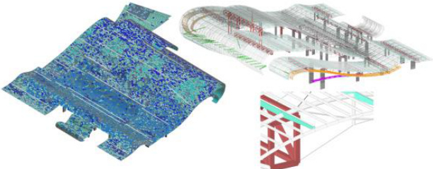 在技术复杂性方面,深圳歌剧院采用双曲面幕墙外壳, 曲面钢结构骨架与型钢混凝土框架核心筒结合的结构形式,双曲面钢结构的建模、加工与安装精度要求 的设计不仅要考虑建筑美学,还需兼顾防风、防水、隔热、光伏等性能设计;智能化舞台机械系统更是涉及机械、电气、控制等多学科交叉,其协同设计难度极大;如图2。