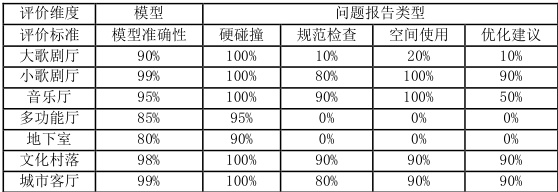 通过对深圳歌剧院各单体建筑的 问题报告进行多轮 总与分类统计(见表 1),去除无效问题后,得出不同团队在质量效益 在小歌剧厅、文化村落、城市客厅的模型准确性达到99%, 型方面,专业团队在规范检查、空间使用和优化建议上表现突 使用和优化建议方面的问题发现率分别达到 80%、100% 和 90%, 、空间使用和优化建议发现率均为 0%。这表明专业团队能够更全面、深入地发 为提升设计质量提供有力支持。