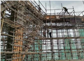 在传统的高处空间曲体梁柱组合独立架构施工中,为确保施工安全, 般是在支承面先搭设模板支撑体系,然后施工完成至各斜柱混凝土工 强度后 部空间曲梁。整个过程需要在梁柱节点处留设施工冷缝,这不 于空间曲体梁柱组合独立架构的每块模板的尺寸和安装角度存 是在高处的模板支撑体系上逐块拼装模板形成整体,需要复核 多次 来回爬动作业,作业人员在高空暴露时间长,钢筋工序施工雷同,均增加了施工危险性。同时, 境因素也对施工质量产生了不良影响。