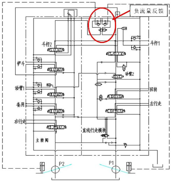结论:通过上述测试结果及液压系统工作原理分析,可初步判定故障原因与双泵合流控制逻辑或相关切换阀组有关,而非前泵P1 或负流量反馈阀本身的问题。