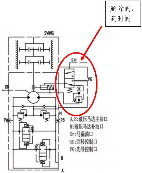 如图2 所示,回转制动释放阀采用两位三通阀结构(图中标注部分)。当执行上车任意操作(如动臂提升、斗杆伸缩等)时,系统会在回转马达的 SH 油口形成液压压力,此压力可实现两位三通阀的换向,接通 PG 先导控制油(PG 为一个常压信号,只要先导阀打开就一直有压力),打开制动器,使回转解除机械制动。