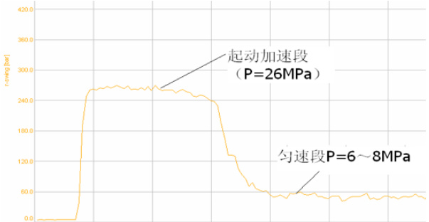 回转压力是否正常:回转马达溢流阀的额定开启压力设定为25.5MPa,综合考虑回油背压的影响,回转马达在启动阶段的正常工作压力应处于 25. 5~26. 5MPa 之间。下图 3 为该吨位机型厂内实测曲线,该曲线表明在上车开始转动时的回转启动压力为26MPa。