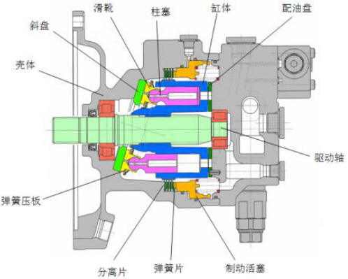 该传动机构在工作过程中同时承受径向载荷和轴向交变作用力。在活塞沿缸体轴线往复运行的过程中,弹簧压板与缸体之间的球面配合结构会产生相互摩擦的位移。在设备持续高速运转过程中,由于摩擦损耗的累积作用,弹簧压板内孔因磨损而逐渐扩大。这种结构变形会引发缸体沿轴向产生下沉位移,进而造成缸体端面与配油盘之间的配合间隙超出设计范围。随着间隙的扩大,高压油液通过增大的缝隙大量渗漏至马达腔体内部,导致系统压力显著下降,