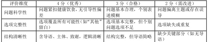 如在课题《校园食堂饮食健康调查与改善提案》中,笔者指导学生开展问卷设计,在任务开始前,向学生发放《问题设计评价量规》,明确以下标准: