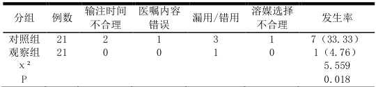 观察组:在常规静脉药物配置的基础上,新增审方药师的审核环节。(1)智能审方。药师将医师开具的处方输入到医院智能化药物管理系统中,对药物属性、物理特性、剂量、给药途径、适应证等信息依次进行智能审核,结合系统中的临床诊疗指南交叉验证处方的合理性,发现处方剂量、配伍、用药方式等存在异常打回医师处重新修改,开具新的处方再提交到智能药物管理系统中。(2)审方药师严格遵循用药规则对静脉用药配置环节进行管控,使用智能配药设备、高精度电子秤等仪器精确每种药物的使用剂量,确保静脉药物的溶媒、输注方式选择正确。(3)审方药师全程监控药品的质量,根据处方上标注的药品,核对各类药品的有效期、性状、存储条件、规格等参数,药品调配期间实时监测其流转情况,直至药物配发到相应的科室。(4)药物混合配伍优化。审方药师在审核药物配置情况时,可利用模拟软件对药物配伍的稳定性、相容性进行测试,纠正不合理的药物配伍方案,帮助医师制定更加安全有效的药物配伍方案。(5)结合患者病情对处方合理性进行审核,预测患者病情与处方用药方案的契合度,若发现用药方案不符合患者情况应及时通知医师修订处方,或根据患者用药需求调整药物浓度。(6)与各科室做好信息互通,实现对患者用药的实时监测与反馈,记录患者的用药效果、用药感受与不良反应,根据患者的用药情况评估是否需要调整用药剂量或变更药物类型。