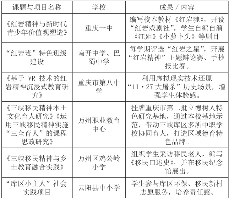 2005 年重庆市委、市政府正式将红岩精神和三峡移民精神确立为重庆的两大代表性精神。近年来重庆各大中小学围绕两大精神结合本地红色文化资源,构建课程体系,开展了丰富多彩的红色文化教育实践,打造了一批红色文化德育品牌。其中《红岩精神引领下的“大思政课”实践路径研究》重庆市教科院,2023年市级重点课题)与《三峡移民精神融入中小学德育的校本化探索》(万州区教委)两个课题获全国德育创新案例奖。