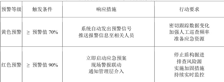 既有线结构监测与预警是保障既有线安全运营的重要手段,这就要求建立一套高精度、全方位的监测体系,在既有线隧道内布置了沉降监测点、收敛监测点、裂缝监测仪等设备,实时监测隧道的沉降、收敛变形以及结构裂缝发展情况。同时,在轨道上设置轨道几何状态监测装置,精确测量轨道的轨距、水平、高低等几何参数变化。此外,利用自动化监测技术将监测数据实时传输至监控中心,通过专业软件进行分析处理,生成变形曲线和报表。设定严格的预警值,当监测数据达到预警值的 70% 时,发出黄色预警,提醒相关人员密切关注;达到预警值的 90%HJ ,发出红色预警,立即启动应急预案(如表1 所示)[5],这样能够及时发现既有线结构的异常变化,为采取相应的保护措施提供依据。