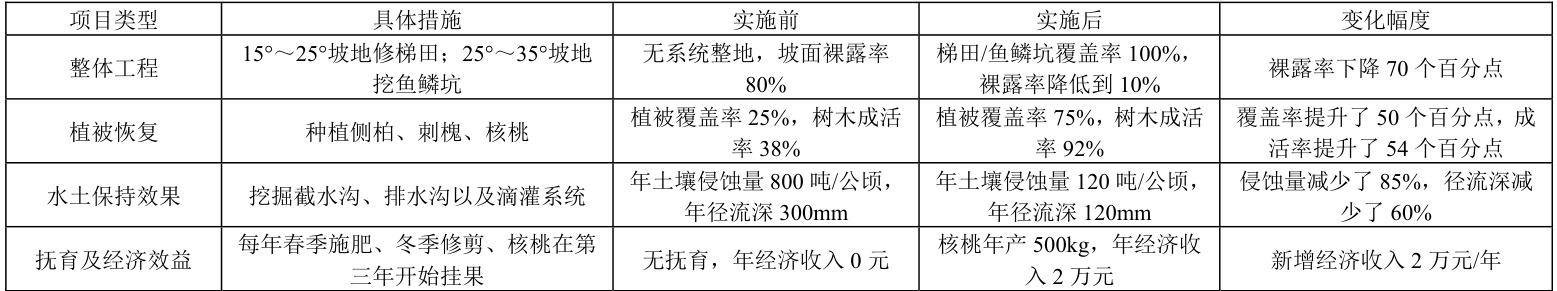 在坡地造林的过程中,将水土保护与抚育施工一体化实践应用,改善了该地区的生态环境,促进了其生态的保护与恢复。具体技术实施及效果,见表1。