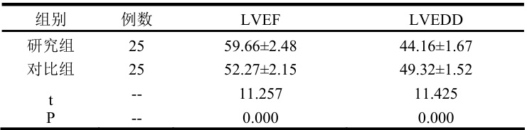 研究组患者左室射血分数(LVEF)较对比组升高,且左室舒张期末内径(LVEDD)相较对比组显著下降( (P<0.05) )。见表1.
