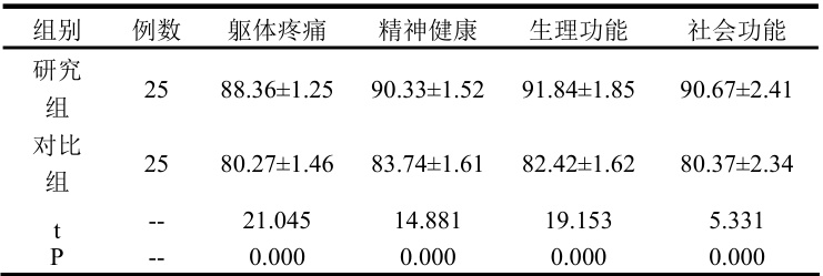 (2)SF-36 量表评估患者日常生活质量,包含社会功能、精神健康、生理功能以及躯体疼痛 4 项内容,总分值 100 分,评估得分与术后生活状态呈正比。