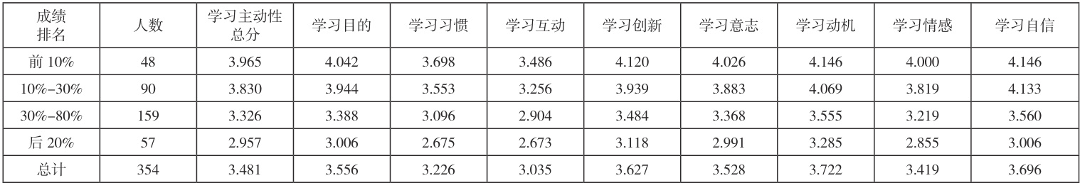 如表 1 所示,通过对比各成绩段的学员在学习主动性及其各维度的得分情况,可以发现学习成绩与学习主动性密切相关。以学习成绩后 20% 的学员为例,其学习主动性得分为2.957,所有学员学习主动性平均得分为3.481 ;在学习目标维度上的得分为3.006,平均得分为 3.556 ;在学习习惯维度上的得分为 2.675,平均得分为 3.226 ;在学习互动维度上的得分为2.673,平均得分为 3.035 ;在学习创新维度上的得分为3.118,平均得分为 3.672 ;在学习意志维度上的得分为 2.991,平均得分为 3.528 ;在学习动机维度上的得分为 3.285,平均得分为 3.722 ;在学习情感维度上的得分为 2.855,平均得分为 3.491 ;在学习自信维度上的得分为3.006,平均得分为 3.696