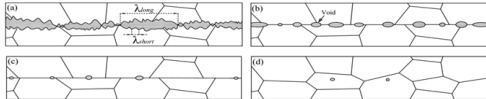 空洞闭合是获得高质量接头的前提条件。空洞演化过程主要归因于若干消除空洞的演化机制的共同作用:(1)变形机制,包括塑性变形和蠕变;(2)扩散机制,包括表面扩散,界面扩散和体扩散。不管采用何种常规表面处理方式处理待连接表面,实际的微观表面呈现出粗糙不平的。在使两个待连接表面相互贴合后,两表面只有少量的长的表面凸起接触,从而形成一排具有不规则形状的空洞,如图4.36(a)所示。随着在连接试样上施加一定的压力,连接界面上的接触应力超过材料本身的屈服强度。在这种情况下,相互接触的两表面凸起开始发生局部的塑性流动,使连接面积迅速的增加,直到界面上的接触应力小于材料的屈服强度这种塑性流动停止。这个过程发生的速度很快,可以看作瞬时过程。随着连接的进行,由于材料发生变形的原因,原来两表面上的短波长凸起接触,使得界面空洞的数量增加并且尺寸减小。当全部的短波长凸起接触,空洞数量达到最大值,如图4.36(b) 所示。进一步延长连接时间,扩散机制和蠕变机制继续作用于空洞演化,导致空洞尺寸的减小和数量的减少,如图 4.36(c)所示。由于空洞的逐渐消失,空洞对界面晶界的钉扎力减小,界面晶界开始迁移,但是还是会有少量的空洞会残留在晶粒内,如图 4.36(d)所示。