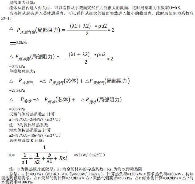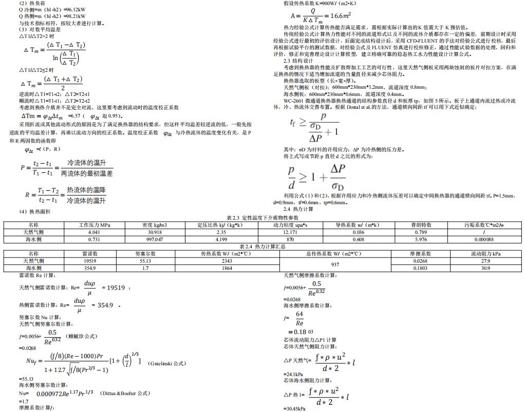 PCHE 高效换热器样机(WC-2601 换热器)利用海水冷却天然气,工艺要求其换热负荷大于80kW,设计压力 13MPaG,设计温度100℃,操作工艺数据如表所示,天然气设计处理量为30 万方/天,换热器主体材质为钛合金耐腐蚀材料,芯体由板材扩散连接,使用寿命20 年。