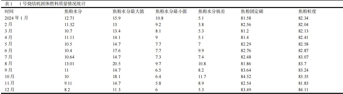 在烧结生产过程中,燃料质量是影响固体燃料消耗的关键因素之一。尤其是燃料的粒度、热值、固定碳以及水分等主要质量指标,对烧结过程中的燃烧效率和能量利用有着直接且显著的影响。对于 1 号 烧结机而言,在对所耗固体燃料的各项主要质量指标进行长期监测和分析后发现,水分波动较大是最为突出的问题。因此,针对 1号 烧结机的实际情况,重点聚焦于固体燃料水分变化对固体燃料消耗的影响。