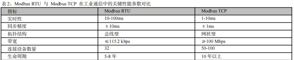 较于 Modbus RTU,Modbus TCP 不仅更适应工业现场对实时性的要求,还能顺利接入现代工业以太网架构,是推动工业系统向数字化转型的理想过渡协议。以包装机中的送料与定位控制为例,Modbus RTU 与 Modbus TCP 在核心性能方面的对比如下:表 2:Modbus RTU 与 Modbus TCP 在工业通信中的关键性能参数对比