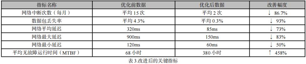 网络系统优化实施完成后的三个月内,相关性能指标显示出显著改善。首先是网络中断次数方面,月均中断从原先的 15 次骤降至2 次,其中 1 次为计划内测试停机,非计划性中断基本得到控制。数据包丢失率由原来的 4.3%降至不足0.3%,在高峰时段依然维持在 0.5%以内,远低于行业容忍标准。延迟方面改善尤为明显,网络通信平均延迟从320 毫秒降至85 毫秒,最大值控制在 150 毫秒以下,最小延迟保持在60 毫秒上下,波动范围缩小 70%以上。此外,系统平均无故障运行时间(MTBF)从 68 小时大幅提升至380 小时以上,网络故障率下降超过80%。这些数据清晰地表明,通过硬件更换、结构优化、协议升级等手段,系统可靠性得到了根本性提升。
