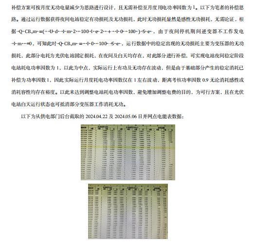 因此,根据计算分析,本项目无功设计可在四台变压器低压侧各配置一套5kvar的无功补偿装置,共20kvar。在夜间电站停机阶段,系统消耗有功依然为0.0011,无功消耗为(20-16.8)/12000=0.000267≈0.0003,此时功率因数为0.965。以4月数据为例,参考供电部门电费单,若4月份已安装20kvar无功补偿装置,根据供电部门实时功率数据截图,按每晚停机后稳定消耗时间10小时算,4月份共30天。安装此无功补偿装置后可减少电网提供有功电量=20*10*30=6000,表单上抄数为7440,安装无功补偿装置后,4月份应抄数为1440,有功抄数不变为4800,可算得本月消耗电量功率因数为0.958,满足供电部考核功率因数,且可获得奖励电费。