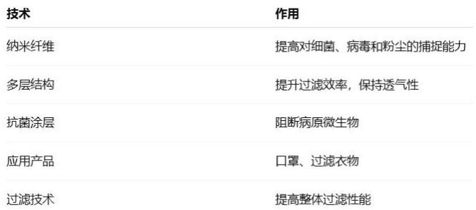 随着全球健康危机的不断加剧,尤其是疫情期间,医疗防护领域对粉尘过滤材料的需求也呈现出快速增长的趋势。特种纺织材料在医疗防护用品中的应用,如口罩、过滤衣物等,成为防止空 ∵ 污染和病毒传播的重要手段。通过采用先进的纤维技术和织物结构,这些防护用品能够有效阻挡细菌、病毒及粉尘颗粒的进入,从而为人员提供更高效的防护。医疗防护领域的需求推动了纺织材料在纳米纤维和高效过滤技术上的应用和创新(见表 1)。