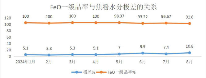 通过定期校准焦粉工艺配加秤,2024 年 1 - 8 月设备始终保持正常运行状态,能够精准执行配加比例。因此,设备稳定性并非导致 FeO 一级品率波动的主要因素。