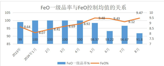 。这一调整显著缩小了 FeO 波动的允许范围,容错率降低,导致生产过程中 FeO 含量超 1 1 % 的试样比例增加,直接造成一级品率下降。
